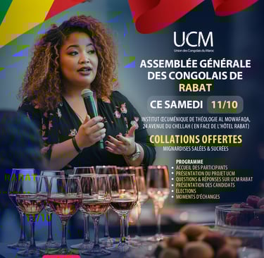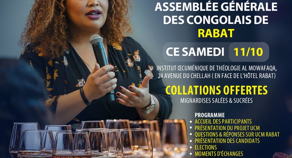 Le samedi 11 octobre 2025, la communauté congolaise résidente à Rabat se rassemblera pour une assemblée générale cruciale, qui aura lieu à l'Institut Oecuménique de Théologie AL MOWAFAQA, au 24 Avenue du Chellah (en face de l'hôtel Rabat). Cet événement, organisé dans le cadre d'un chantier de restructuration et d'unification, est initié par l'union des Congolais du Maroc. L'objectif principal de cette assemblée élective est d'élire les représentants de la communauté congolaise, à Rabat.