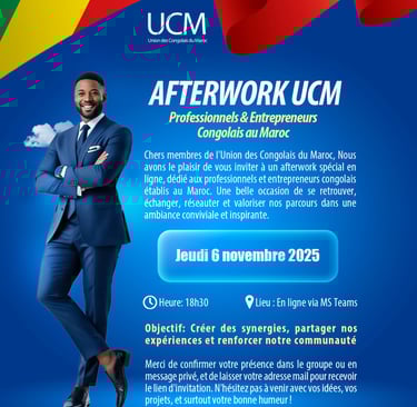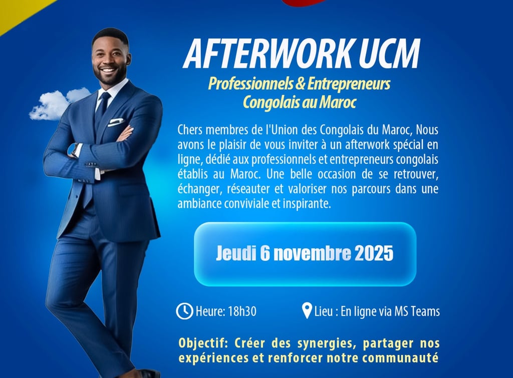 Le département des affaires professionnelles de l'Union des Congolais du Maroc (UCM) a le plaisir d'annoncer un événement captivant destiné à rassembler des professionnels, cadres et entrepreneurs congolais vivant au Maroc. Cet e-afterwork, qui se déroulera en ligne le jeudi 6 novembre 2025, représente une occasion unique de faire connaissance et d’échanger des idées. L'objectif principal de cet événement est de préparer une rencontre future en présentiel, permettant ainsi à tous les participants d'interagir plus profondément.