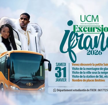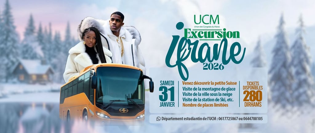 L'Union des Congolais du Maroc (UCM) a le plaisir d'annoncer une excursion exceptionnelle à Ifrane, prévue pour le samedi 31 janvier 2026. Cette sortie représente une opportunité unique pour les nouveaux étudiants de découvrir Ifrane, souvent surnommée la Petite Suisse du Maroc. Avec ses paysages enneigés, Ifrane offre un cadre parfait pour une journée de détente et de découverte.