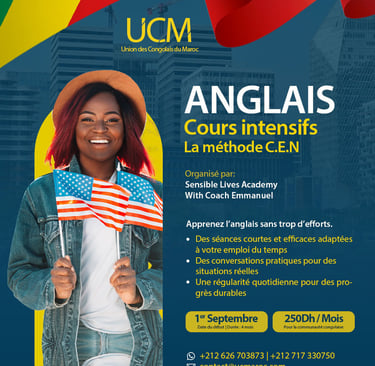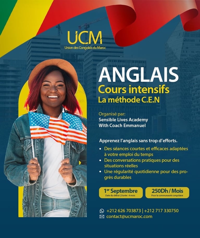 La formation débutera ce 1er septembre, et un tarif exceptionnel a été négocié spécialement pour la communauté congolaise : seulement 250 DH par mois. Ce tarif attractif constitue une opportunité unique pour quiconque souhaite améliorer son niveau d'anglais sans rupture dans leur budget. Pour vous inscrire, il vous suffit de remplir le formulaire ci-dessous.