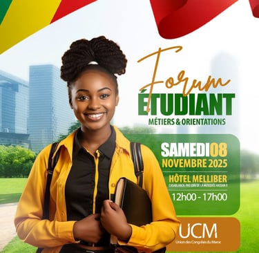 L'union des Congolais du Maroc (UCM) organise un forum étudiant le samedi 8 novembre à Casablanca. Cet événement a pour but de rassembler les étudiants congolais, afin de leur fournir des informations précieuses concernant leurs démarches administratives et les opportunités professionnelles qui s'offrent à eux.